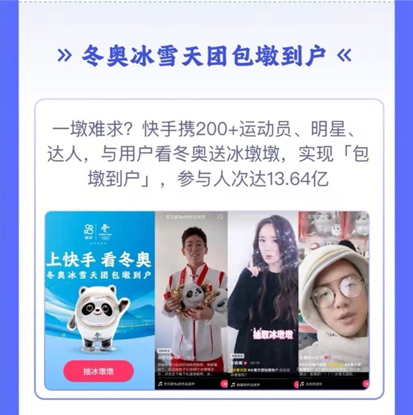 除了精彩內容大放送,快手還緊跟熱點,以實實在在的福利為用戶送上驚喜。冬奧期間,和冰雪運動以及明星健兒同時紅遍全網的,還有“一墩難求的冬奧”吉祥物“冰墩墩”。 快手攜200+運動員、明星、達人,與用戶看冬奧送冰墩墩,實現(xiàn)「包墩到戶」,參與人次達13.64億。用戶在追冬奧的同時也能收獲連綿不斷的驚喜。