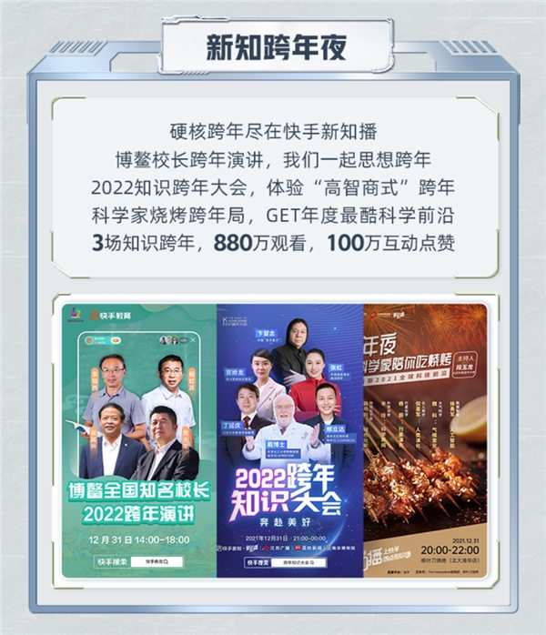 新年期間,快手新知播共組織了3場知識跨年——博鰲校長跨年演講、2022知識跨年大會、科學家燒烤跨年局?!案咧巧獭笨缒攴绞轿?80萬人在線觀看,并以年度最酷科學前沿收獲了100萬互動點贊。