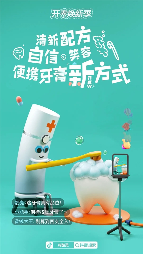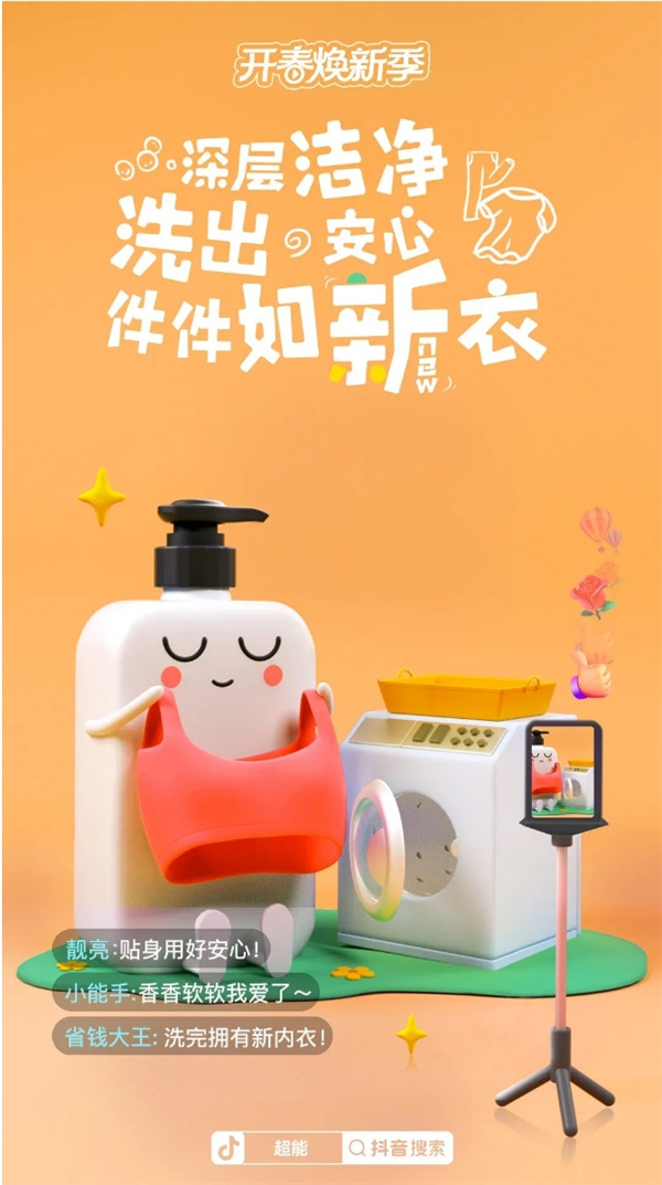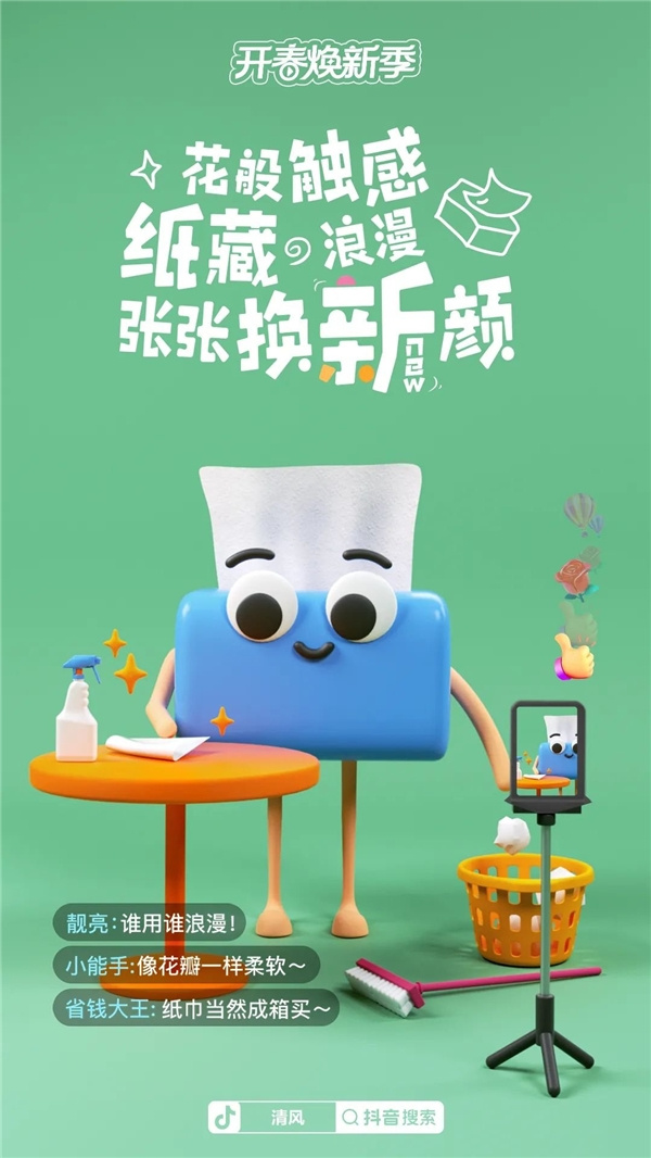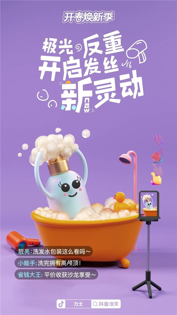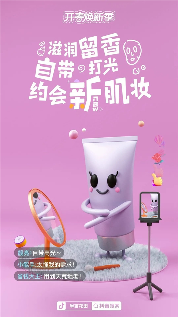為吸引用戶關(guān)注興趣,「開(kāi)春煥新季」早早地備齊了可愛(ài)感爆棚的創(chuàng)意海報(bào),通過(guò)擬人化的高萌形象,展示出個(gè)護(hù)家清鮮花產(chǎn)品日常高頻使用場(chǎng)景?!讣s會(huì)新肌妝」「如廁也要小清新」「開(kāi)啟發(fā)絲新靈動(dòng)」……自帶賣點(diǎn)的創(chuàng)意文案,將「開(kāi)春煥新」落到了具象的消費(fèi)場(chǎng)景,喚醒了用戶沉睡的消費(fèi)興趣與需求。