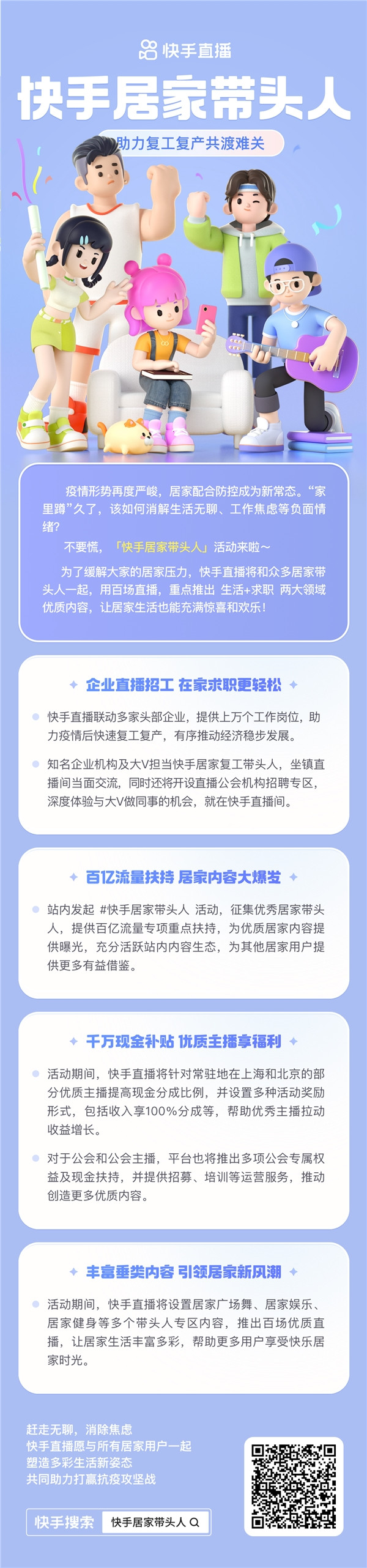 近期,全國(guó)疫情防控工作正進(jìn)入新一輪攻堅(jiān)階段,“五一”小長(zhǎng)假中,多地倡導(dǎo)“非必要不外出”。快手直播積極發(fā)起“居家?guī)ь^人”專項(xiàng)直播活動(dòng),聯(lián)動(dòng)多家頭部企業(yè)、優(yōu)質(zhì)主播發(fā)起百場(chǎng)直播,“云招聘”“云娛樂(lè)”緩解群眾居家壓力,暖心助力居家抗疫。