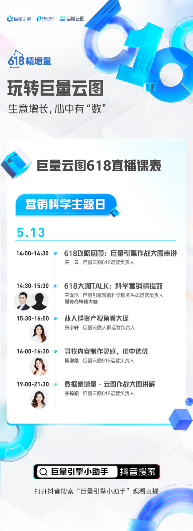 5月13日“營銷科學(xué)主題日”即將開講,多位巨量云圖平臺的負(fù)責(zé)人將聯(lián)合頭部服務(wù)商,從人群、內(nèi)容、數(shù)據(jù)營銷三大不同角度,精細(xì)拆解618提效方法,幫助品牌實現(xiàn)全方位的營銷優(yōu)化。