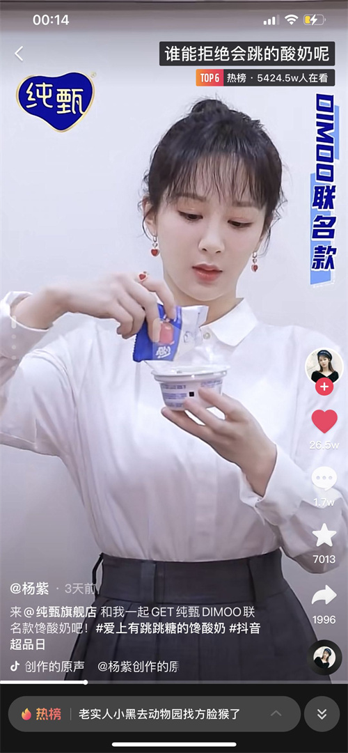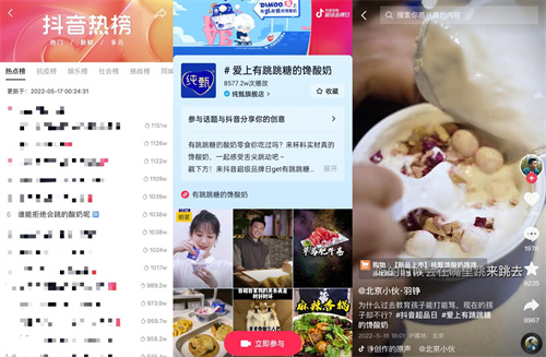 同時(shí)站內(nèi)美食垂類達(dá)人深度拆解酸奶的100種吃法,焦點(diǎn)拉回產(chǎn)品本身,#誰(shuí)能拒絕會(huì)跳的酸奶呢 #愛(ài)上有跳跳糖的饞酸奶 強(qiáng)勢(shì)登榜,純甄+DIMOO=好吃好玩的有跳跳糖的酸奶心智席卷,已獲9159萬(wàn)播放量。