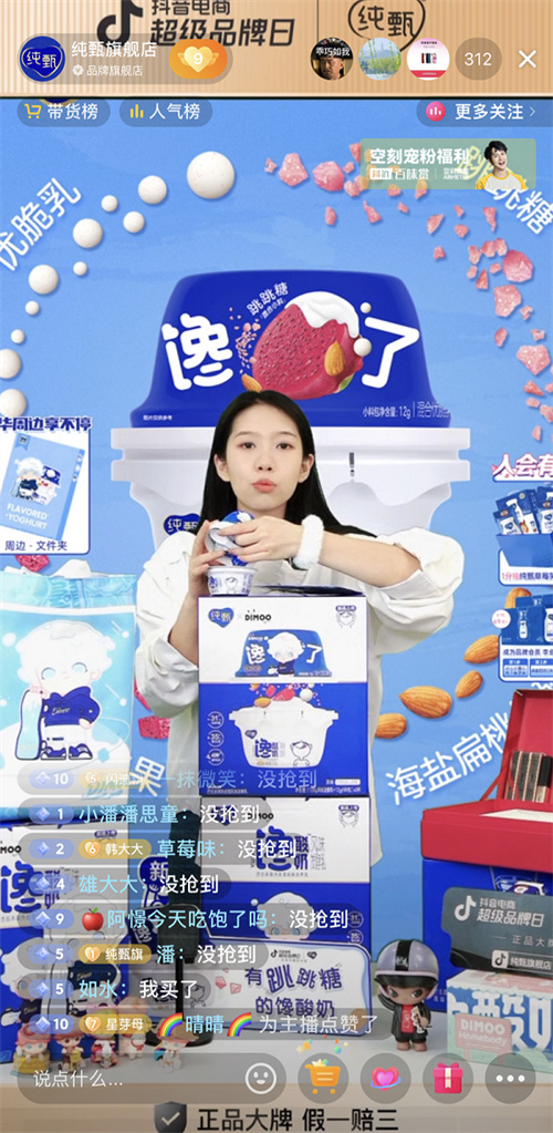 抖音電商超級(jí)品牌日攜手知名品牌蒙牛于5月13日首發(fā)新品——純甄DIMOO聯(lián)名款饞酸奶抖音電商超級(jí)品牌日定制禮盒,全方位整合站內(nèi)獨(dú)家資源助力貨品出圈,這款有跳跳糖的奇趣酸奶上線短短一周,就收獲了4.5億曝光、蒙??侴MV破5000萬(wàn),從熱度到銷量、從站內(nèi)到站外全面開(kāi)花,成為“出道即爆紅”的零食界新網(wǎng)紅。