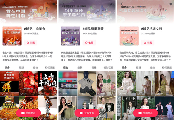 截至6月15日24時(shí),各產(chǎn)業(yè)帶話題頁短視頻播放量排在前三位的分別是#域見川渝美食 #域見織里童裝 #域見杭派女裝,播放量分別達(dá)3843.6萬、3724.8萬、2173.5萬。