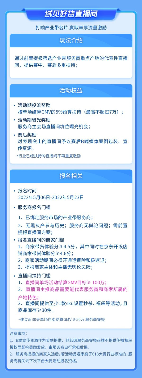 對(duì)于滿足直播間單場(chǎng)活動(dòng)結(jié)算GMV目標(biāo)≥100萬,直播間主推商品能代表服務(wù)商和商家所屬的產(chǎn)地特色等要求的域見好貨直播間,提供活動(dòng)期投流和曝光獎(jiǎng)勵(lì),以及賽后B端媒體案例包、宣傳資源。