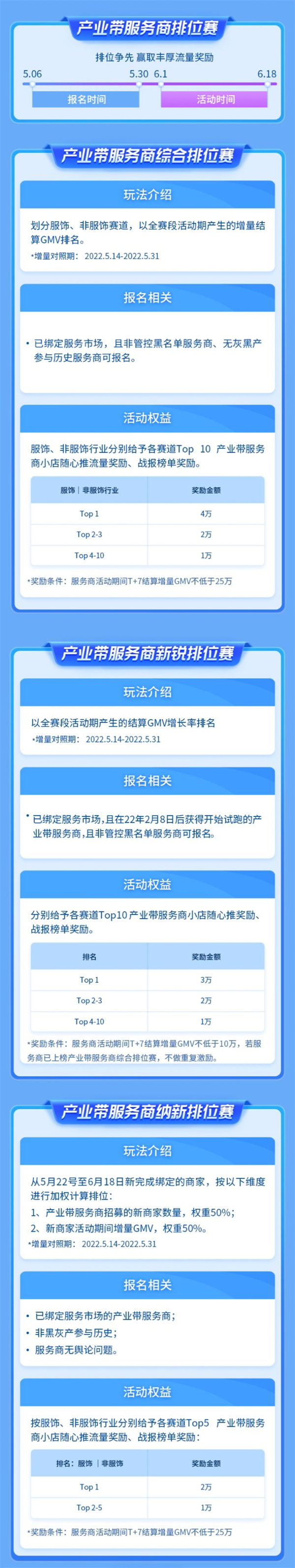 產(chǎn)業(yè)帶服務(wù)商新銳排位賽,鼓勵(lì)新入局產(chǎn)業(yè)帶服務(wù)商,在618期間沖刺GMV。本次挑戰(zhàn)賽只限已綁定服務(wù)市場(chǎng),且在2022年2月8日后開始試跑的產(chǎn)業(yè)帶服務(wù)商參與。根據(jù)全賽段活動(dòng)期產(chǎn)生的結(jié)算GMV增長(zhǎng)率排名,各賽道Top1、Top2-3、Top4-10的產(chǎn)業(yè)帶服務(wù)商都將獲得3萬元、2萬元、1萬元的小店隨心推獎(jiǎng)勵(lì)、戰(zhàn)報(bào)榜單獎(jiǎng)勵(lì)。