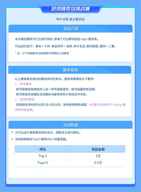短視頻帶貨挑戰(zhàn)賽,劃分為美妝+個(gè)護(hù)、食品飲料+生鮮、親子生活、數(shù)碼家居、服飾+二奢五大行業(yè)。6月1日-6月18日,發(fā)布短視頻帶IP話題#抖音618好物節(jié) #livelog潮流好物計(jì)劃,且總分排在所在賽道Top5的品牌服務(wù)商,都將獲得DOU+流量激勵(lì)。