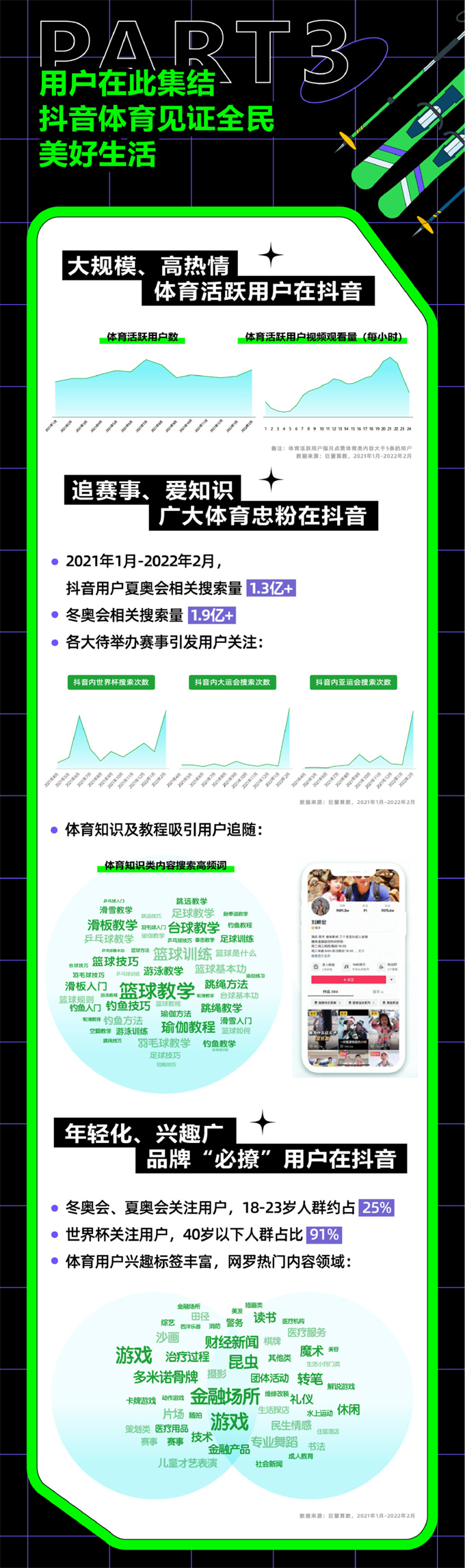 在運動員和達(dá)人們的帶領(lǐng)下,越來越多體育用戶被吸引而來,在抖音看體育、討論體育、記錄體育生活?!栋灼凤@示,在2021年1月至2022年2月期間,共有1.2億+抖音用戶在抖音發(fā)布體育類視頻,記錄美好的體育生活,站內(nèi)體育類興趣用戶高達(dá)4.7億+。