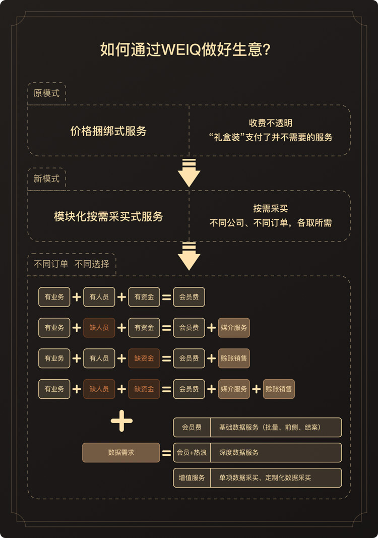 從價(jià)格、資金、人力三個(gè)維度進(jìn)行WEIQ經(jīng)營(yíng)模式的調(diào)整,結(jié)合WEIQ平臺(tái)資源優(yōu)勢(shì)和功能升級(jí)為服務(wù)商降本增效,幫助企業(yè)提高經(jīng)營(yíng)利潤(rùn)和效率,減輕壓力,擴(kuò)大業(yè)務(wù)創(chuàng)造更大價(jià)值。