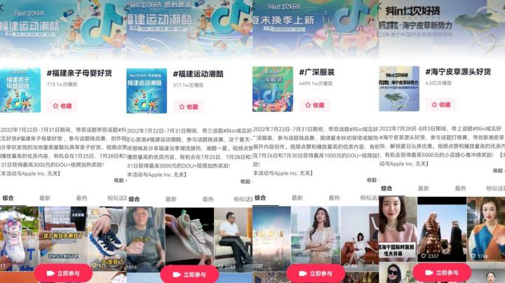 7月22日-7月31日,抖音電商抖in域見(jiàn)好貨·福建運(yùn)動(dòng)潮酷活動(dòng),通過(guò)“線下招商會(huì)+線上服務(wù)商排位賽”為當(dāng)?shù)氐姆椇陀H子類目插上銷售的翅膀。