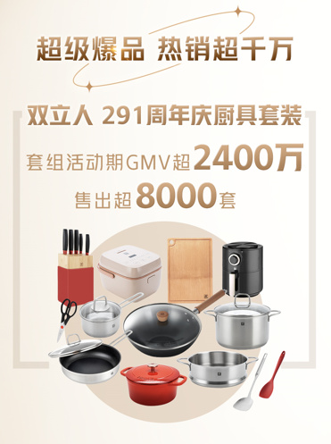 在豐富營(yíng)銷(xiāo)玩法的同時(shí),抖音電商超級(jí)品牌大賞攜手雙立人集結(jié)熱賣(mài)單品,首發(fā)推出291周年禮盒大套組,破圈決心盡顯,期間活動(dòng)售出超8000套,銷(xiāo)售額超2400萬(wàn),雙立人品牌聲量與銷(xiāo)量大獲全勝。