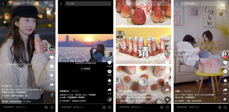 好的達人內(nèi)容是新品走進用戶內(nèi)心的介質(zhì)。在達人內(nèi)容策略上,伊利運用巨量云圖洞察品牌人群偏好,以個性化、多圈層內(nèi)容創(chuàng)意豐富品牌內(nèi)涵。比如配合平臺生活美食相關(guān)的IP,形成內(nèi)容破圈,提升品牌主張,幫助安慕希AMX丹東草莓酸奶新品積累用戶談資。