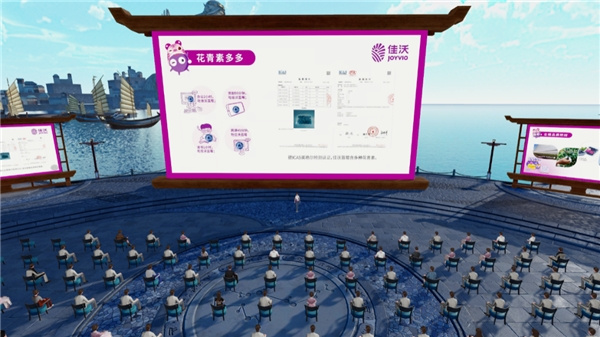 還通過三維技術將秘魯藍莓推薦會搬進元宇宙,通過佳沃品牌推薦官的宣講和會場內(nèi)50多張展板的呈現(xiàn),從全產(chǎn)業(yè)鏈的角度向玩家展現(xiàn)出佳沃秘魯藍莓不斷升級的甄選品質(zhì)。元宇宙內(nèi)還設置了藍莓知識問答、彩蛋收集等趣味游戲,讓玩家欣賞元宇宙風光的同時,沉浸式體會花青素對眼睛的益處,將“用眼過多,吃佳沃藍莓”的品牌理念根植進消費者心中。