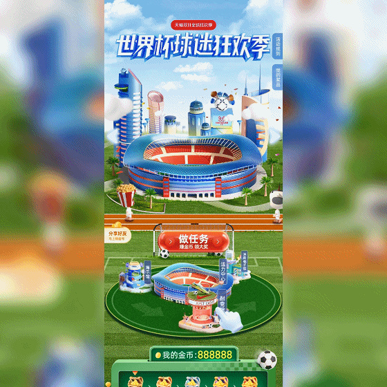 在足球狂歡城里,阿里媽媽平臺營銷策劃中心打造的是年輕化的視覺表達(dá)和互動體驗。例如,除了通過做任務(wù)贏取金幣這樣的常規(guī)互動,在足球狂歡城里的耐克館、海爾館,用戶也能通過玩世界杯相關(guān)的小游戲獲得相應(yīng)獎勵。