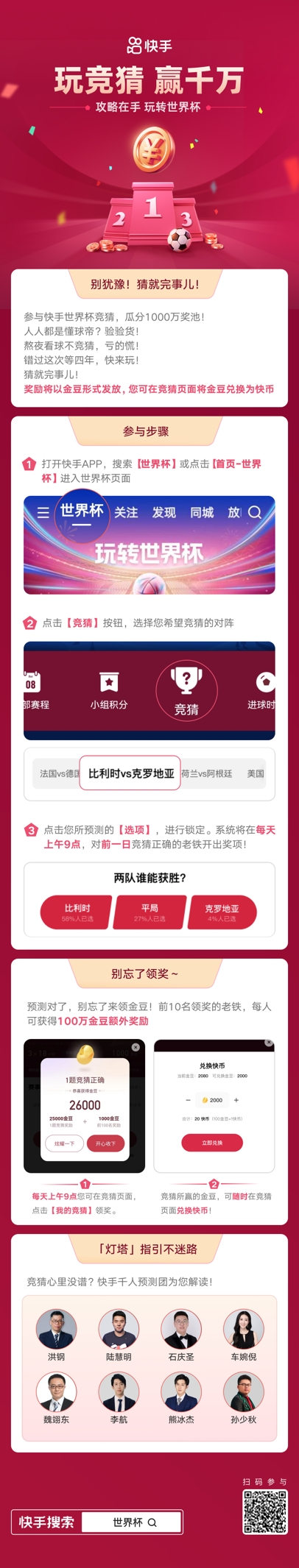 在這四年一度的足球盛宴,快手推出世界杯競猜互動玩法和內(nèi)容,設置了價值千萬人民幣的獎池,拉滿觀賽競猜氛圍,還有“世界杯千人預測團”加入,由足球解說評論員、足彩專家、足球運動員等專家提供更專業(yè)的賽事分析,幫助老鐵猜冠軍更有門道。
