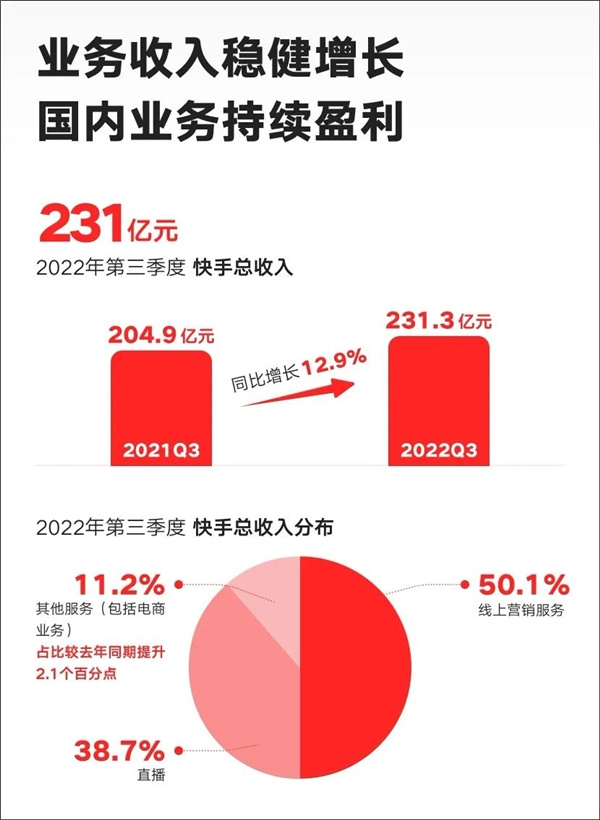 財報顯示,第三季度,快手總營收達(dá)231.3億元,國內(nèi)經(jīng)營利潤超3.75億元,連續(xù)兩季度實現(xiàn)單季盈利??焓值娜栈?、月活用戶規(guī)模持續(xù)增長,并突破歷史新高。廣告、直播、電商三大核心業(yè)務(wù)都出現(xiàn)了增長,其中,快手直播業(yè)務(wù)收入為89億元,同比增長15.8%。