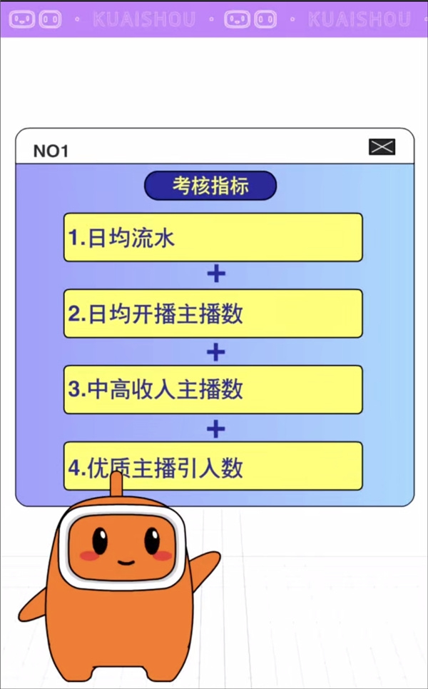 整個活動首先會按照報名公會2022.10.18-2022.11.16在快手后臺的總流水(剔除公會大V流水)劃分三個等級,按照不同等級設(shè)置不同的考核任務(wù)??己司S度主要是:日均流水、日均開播數(shù)、中高收入主播數(shù)、優(yōu)質(zhì)主播引入數(shù),公會大V主播并不計入這四項考核中。