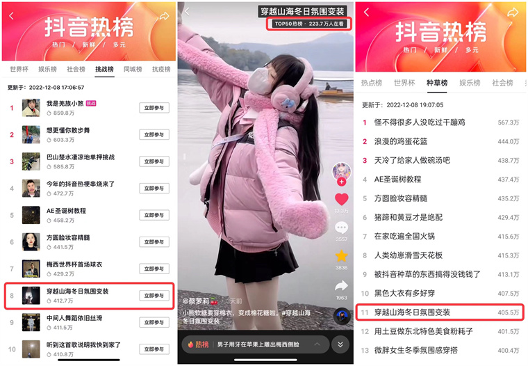 最終,#穿越山海冬日氛圍變裝 登抖音挑戰(zhàn)榜TOP8、抖音熱榜TOP50、種草榜TOP11