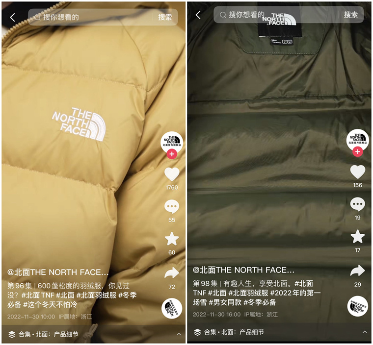 另外,北面The North Face亦在自己的官方賬號(hào)下巧妙借勢(shì)平臺(tái)熱點(diǎn)話題#2022年的第一場(chǎng)雪、#這個(gè)冬天不怕冷 等,拉升傳播聲量,呈現(xiàn)產(chǎn)品細(xì)節(jié)賣點(diǎn),以情感共鳴的方式激發(fā)消費(fèi)者情緒。