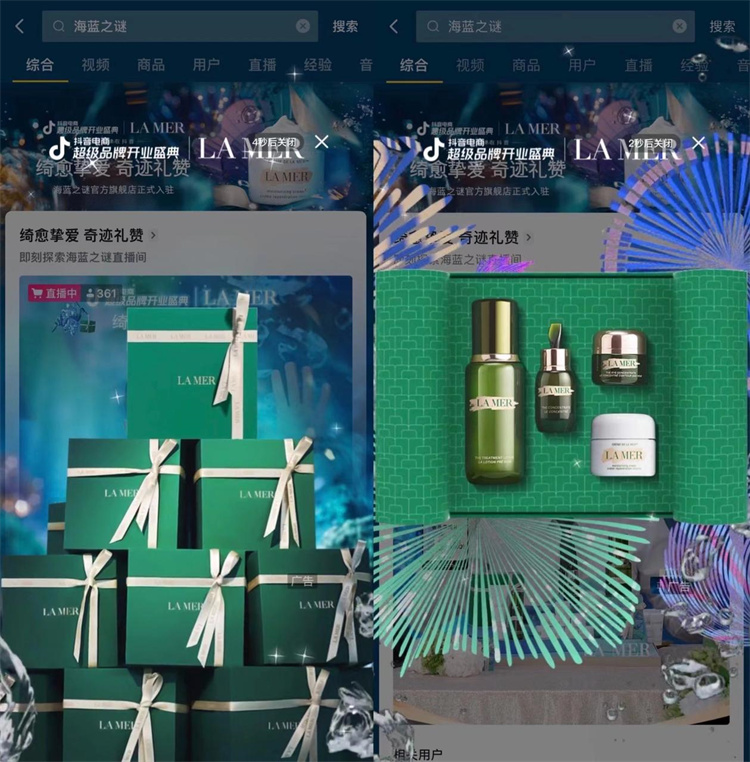 值此雙旦節(jié)點之際,筆者發(fā)現(xiàn)海藍之謎已入駐抖音電商,在抖音電商超級品牌開業(yè)盛典期間以其明星產(chǎn)品與節(jié)日限定禮盒吸引到大量用戶,并在此期間進行了全鏈路營銷的有效整合,實現(xiàn)了產(chǎn)品轉(zhuǎn)化率的提升,這些操作有效幫助品牌拓寬了生意場域。