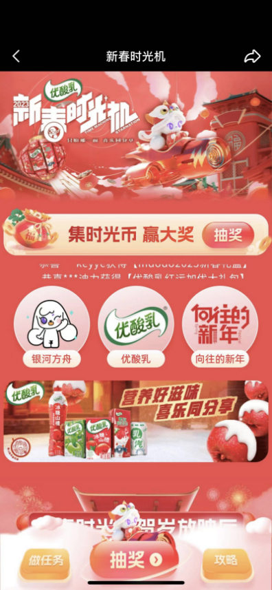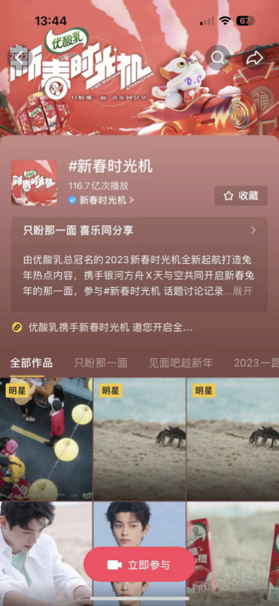 在心智種草層面,優(yōu)酸乳基于抖音陣地,結(jié)合多平臺傳播完成差異化溝通。在抖音平臺,優(yōu)酸乳掀起沉浸式社交新體驗,主話題#新春時光機 總瀏覽量達到131億+,50+明星藝人、抖音創(chuàng)作者拜年造勢,送出新春祝福。