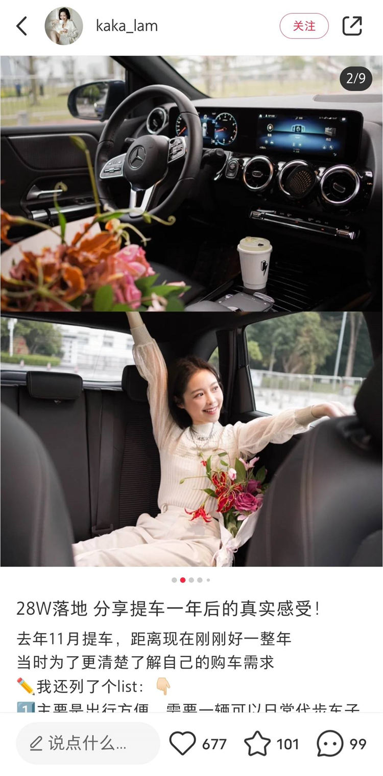@kaka_lam分享了自己喜提深藍(lán)色奔馳進(jìn)口版B200一年后的真實感受。坐在駕駛座,手握方向盤,仿佛擁有了面對生活的底氣,通勤路上也有了遮風(fēng)擋雨的愛車,滿滿幸福感!