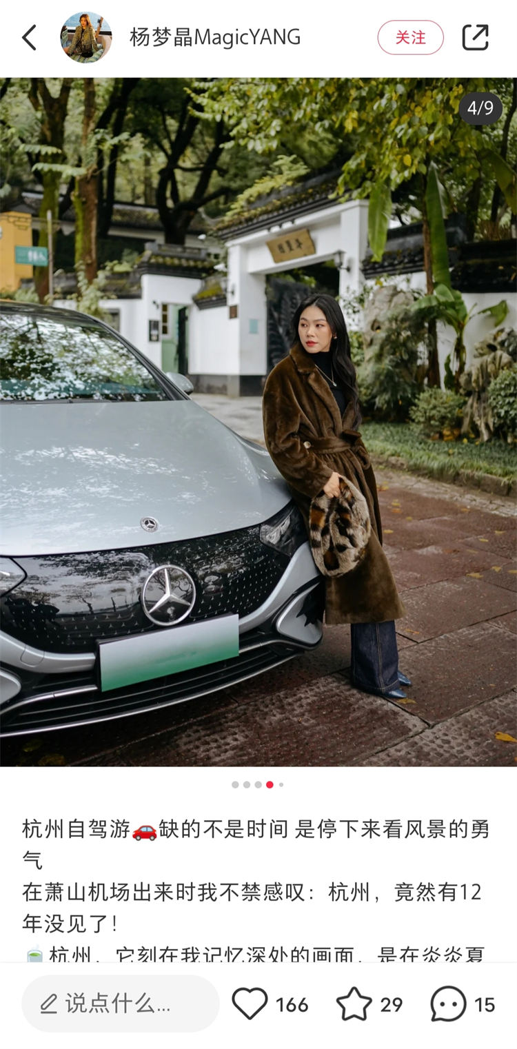 @楊夢晶MagicYANG短暫拋開工作,和好友開啟一場說走就走的杭州自駕游。奔馳EQE的752KM超長續(xù)航,讓他們可以安心游玩,盡情享受久違的悠閑與自由。