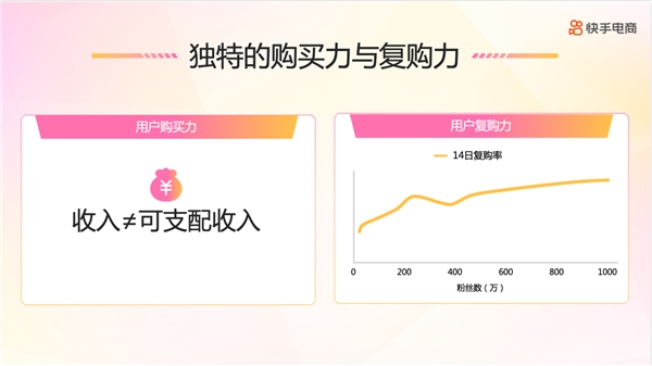 第三個,客單價。有一些品牌經(jīng)營者并不是快手深度用戶,所以對新一線城市收入和可支配收入這兩個概念有一定混淆。新一線城市收入確實沒有北上廣高,但可支配收入未必,例如疫情對于新一線城市的影響相對比較小,但對一線城市影響非常巨大。所以小鎮(zhèn)青年和一線城市群體都具有獨特的購買力。而快手這三種價值也正被越來越多品牌所認識。