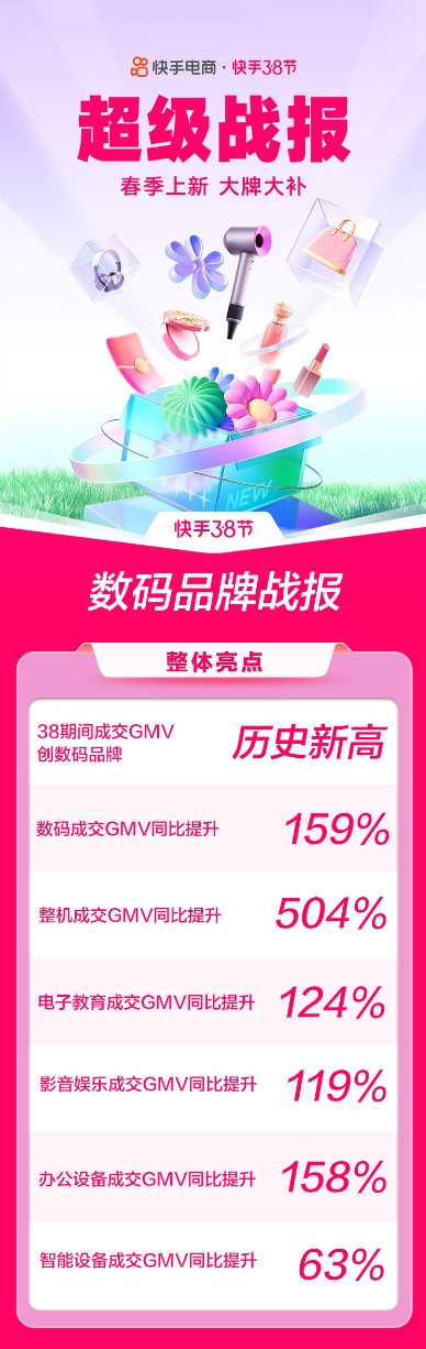 戰(zhàn)報(bào)數(shù)據(jù)顯示,快手電商數(shù)碼行業(yè)38節(jié)期間成交GMV突破歷史新高,較此前同比提升159%,數(shù)碼整機(jī)成交同比提升504%,電子教育成交GMV同比提升124%,影音娛樂成交GMV同比提升119%,辦公設(shè)備成交GMV同比提升158%,智能設(shè)備成交GMV同比提升63%。