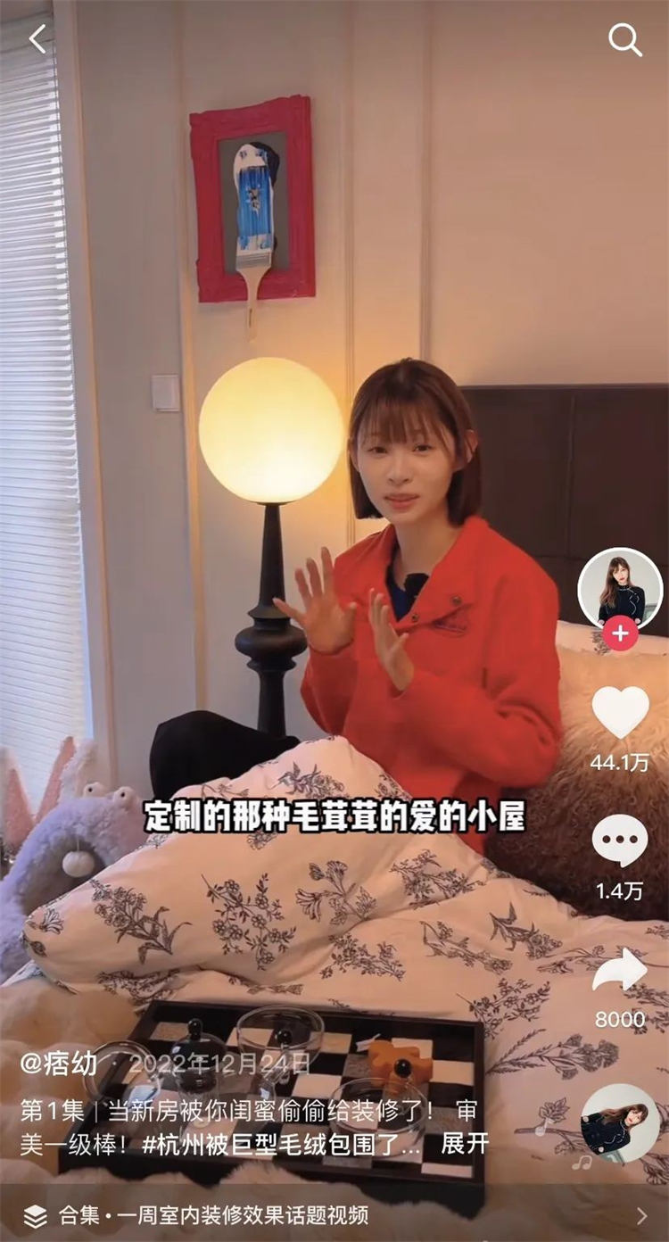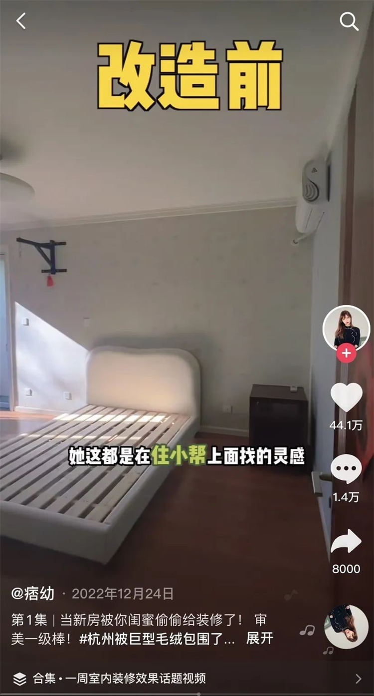 其次,為提升投放效果,用好跨界達人進行內(nèi)容破圈,星圖優(yōu)選協(xié)助住小幫進行營銷創(chuàng)意主題包裝,打造“放松點”住家場景概念,并圍繞@痞幼近期的房屋改造內(nèi)容,植入裝修種草興趣點,成功向粉絲安利了一波住小幫。高契合度的內(nèi)容種草,能夠幫助品牌實現(xiàn)人群破圈,讓營銷效果事半功倍。