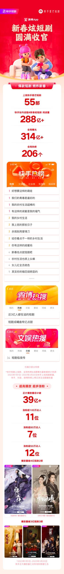 從2021年起,快手相繼推出“追劇嗨更季”、“追劇一夏”等活動,為觀眾帶來了《長公主在上》《胡同兒》《仁心》等多部優(yōu)良短劇。而在今年春節(jié)期間,快手重磅推出“新春炫短劇”特別活動,集結(jié)了55部+快手星芒短劇,涵蓋國韻古風、青春校園、都市情感等多元題材。
