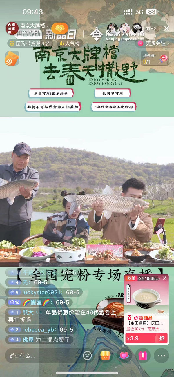 除用優(yōu)質(zhì)短片吸引用戶關(guān)注之外,南京大牌檔還推出了全國寵粉專場直播。該直播場景設(shè)立于戶外郊野,湖泊、草地、遠(yuǎn)山及盛開的桃花等美景躍現(xiàn)于鏡頭之中,有力增強(qiáng)了直播間“去春天撒野”嘗鮮的氛圍。同時,本場直播也不僅局限于推廣品牌新品菜單,而側(cè)重于向觀眾普及如何鑒別“七頭一腦”等與菜品相關(guān)的干貨信息,并融入蘇州評彈、飛花令等充滿南京文化特色的內(nèi)容和互動。