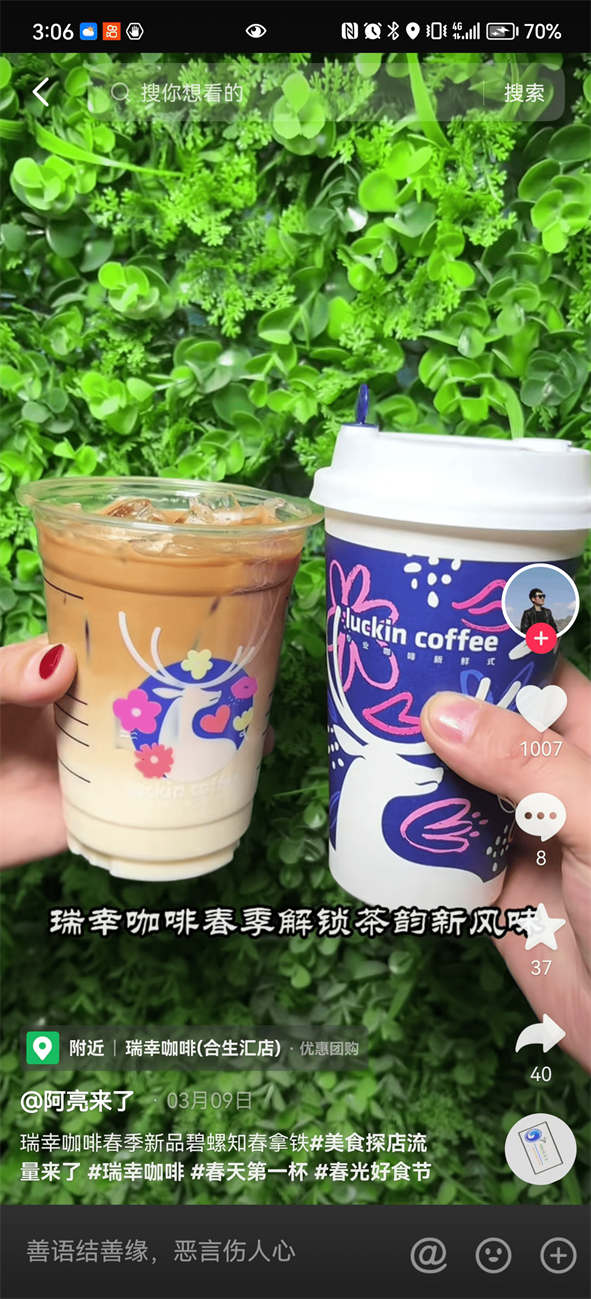 咖啡品類更是春日營銷的主力軍,3 月 6 日,瑞幸官宣新品「碧螺知春拿鐵」,新品與被譽(yù)為「鄉(xiāng)村超?!沟年懴扇撕献?。在新品推介過程中,瑞幸不僅將直播間搬到了生茶園,打造沉浸式的直播體驗(yàn),讓用戶在觀看直播享受“寵粉式”福利的同時(shí),感受到濃濃的春日氛圍感。不僅如此,瑞幸邀約了一萬名LV3以上的短視頻達(dá)人,借助帶貨達(dá)人力量為瑞幸茶咖季種草引流,引發(fā)站內(nèi)視頻投稿數(shù)4.7萬條。同期,瑞幸咖啡篩選了33位直播達(dá)人,在多城市開展了“瑞幸茶咖季”為主題的系列達(dá)人直播,通過直播達(dá)人承接品牌官方自播熱度和流量?!复汗夂檬彻?jié)」?fàn)I銷節(jié)點(diǎn)中,通過短視頻種草、官方直播及達(dá)人直播,以一系列別具一格的“茶咖大秀”實(shí)現(xiàn)破圈層營銷,迅速完成種草全網(wǎng),最終獲得破億的支付GMV。