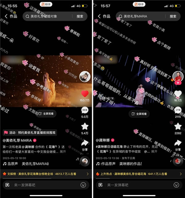 在《乘風(fēng)2023》第二期,美依禮芽和龔琳娜合作《花海》舞臺,兩大歌姬用中日對唱的形式,把這首曲目演繹得如泣如訴,再一次驚艷了全網(wǎng)。為此快手推出專屬彈幕特效,在快手搜索「龔琳娜」或「美依禮芽MARiA」,到本人公演視頻評論區(qū)發(fā)彈幕,就能為她們鋪一片浪漫“花海”。