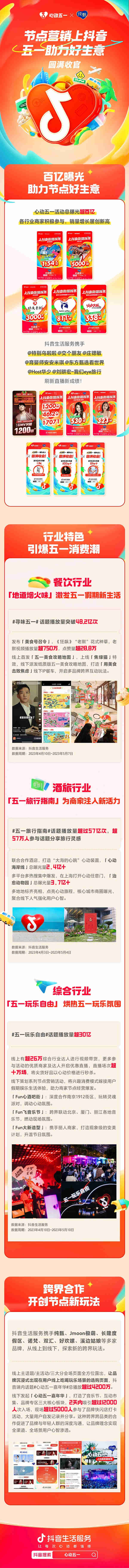作為2023年重要的消費(fèi)節(jié)點(diǎn),抖音生活服務(wù)推出「心動(dòng)五一」活動(dòng),攜手海量商家,打造“線上+線下”的立體營(yíng)銷模式,覆蓋消費(fèi)者吃喝玩樂全場(chǎng)景。超百億的曝光、餐飲/酒旅/綜合行業(yè)定制花式玩法、品牌跨界合作,助力商家掌舵五一假期流量盤,促進(jìn)品牌生意爆發(fā)增長(zhǎng),構(gòu)建節(jié)點(diǎn)營(yíng)銷新生態(tài)。