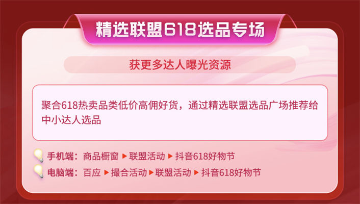 從種草蓄水到深度激發(fā)消費意愿,再到最終完成交易,內容始終達人經(jīng)營的主戰(zhàn)場。抖音618好物節(jié)將通過豐富的內容爆發(fā)玩法,為達人618生意增長突圍提供助力。「好物直播間」將為達人提供運營、貨品補貼扶持,幫助達人找到更高效的直播帶貨方法論;「精選聯(lián)盟618選品專場」則為中小達人與商家的撮合提供了一個高效渠道,達人可以獲得更豐富的貨品選擇、更多元的高傭好貨,用好物種草撬動事業(yè)增長。