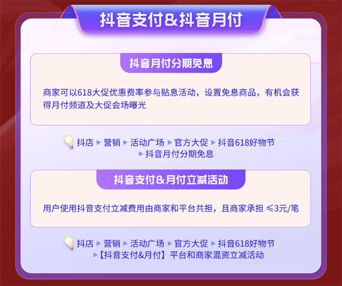 在財經(jīng)玩法方面,「抖音支付&抖音月付」將分別通過分期免息、支付立減等方式,加快用戶交易決策;「放心借-小微專享」與「提前收款」將解決商家資金周轉問題、縮短收賬周期,為商家提供更良性的生意環(huán)境;還有「運費險」補貼保障,促進用戶下單轉化,減少商品退換貨產(chǎn)生的運費糾紛。