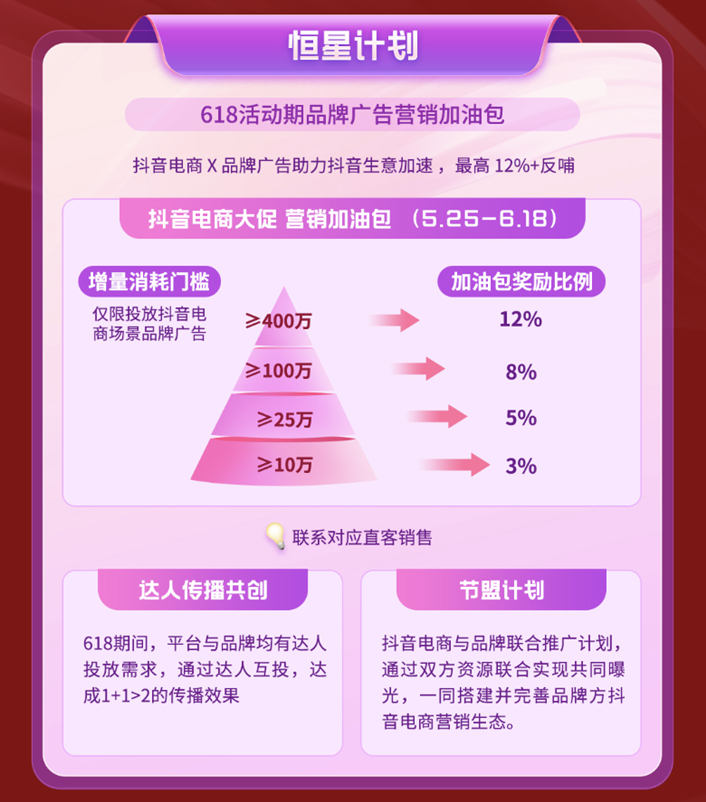 為了促進全域增長,抖音電商還推出了營銷增長、財經(jīng)補貼玩法,幫助商家進一步拉升人群、貨品與生意增長。「巨量千川」將通過百億流量扶持,為全量廣告客戶與新客戶分別推出激勵紅包、加速包、流量包等扶持;「恒星計劃」將為商家提供品牌廣告營銷加油包,以最高12%的反哺,助力抖音生意加速;此外,「達人傳播共創(chuàng)」與「節(jié)盟計劃」也將分別通過達人互投放、資源聯(lián)合等方式,共建完善的大促營銷生態(tài)。