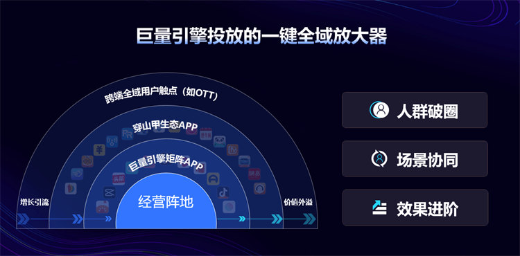 第一層,是放大“流量雷達”的探測范圍,幫助客戶實現(xiàn)從線上到線下,從域內(nèi)到域外的全域流量精準覆蓋。