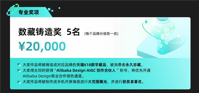主要專業(yè)獎項分為“數(shù)藏鑄造獎”5名和“數(shù)藏創(chuàng)作獎”30名,還有人氣獎項“數(shù)藏人氣獎”5名,總獎金高達(dá)人民幣14萬元(所有獎金均為稅前金額,由主辦方代扣代繳個人所得稅),大獎作品還將被鑄造成對應(yīng)品牌的天貓618數(shù)字藏品,被消費者永久珍藏。