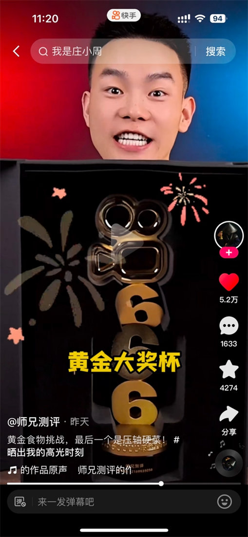 而美食區(qū)的師兄測(cè)評(píng)(快手ID:2169935056)就玩的更花了,狠狠咬一口獎(jiǎng)杯不說,更是認(rèn)證:快手獎(jiǎng)杯還真不是真金的!