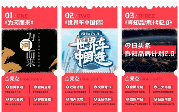 「世界車中國造」由今日頭條深度整合頭抖雙端資源,頭條十大官方頻道攜手權威機構發(fā)起,打造汽車行業(yè)垂直內容營銷。通過央媒精品紀錄片,以極具看點的名咖自駕海外游世界欄目,向國人傳遞品牌高格調走出國門的品牌形象通過強影響力的媒介與大咖發(fā)起全民征文引發(fā)全民熱議。四大合作價值助力品牌營銷“走出國門”!