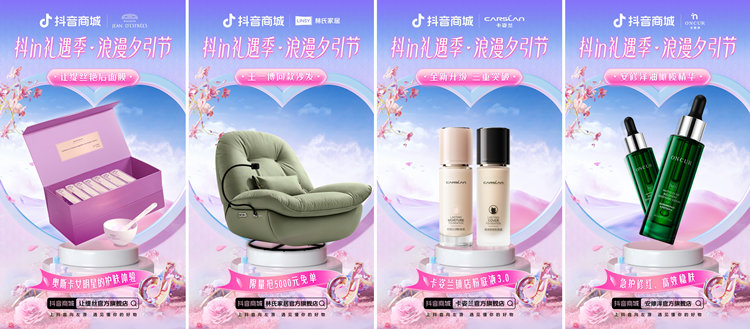 8月7日-8月13日,活動海報登陸北京、上海、廣州等一線城市的多個核心商圈大屏。在此基礎(chǔ)上,抖in禮遇季·浪漫夕引節(jié)匹配了抖音開屏、阿拉丁搜索、直播間指示器、話題頁等抖音電商稀缺資源,實現(xiàn)高效的聚合展現(xiàn)和流量轉(zhuǎn)化?;顒雍?更是在抖音電商七夕禮遇季活動主會場專設(shè)“浪漫夕引節(jié)”板塊,持續(xù)為活動品牌進(jìn)一步推進(jìn)生意爆發(fā),實現(xiàn)長效種草。