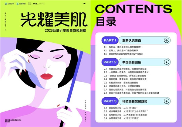 IP項(xiàng)目期間,巨量算數(shù)攜手基礎(chǔ)顏究、OIB.CHINA共同發(fā)布「光耀美肌-2023巨量引擎美白趨勢(shì)洞察」白皮書,首次披露抖音美白行業(yè)數(shù)據(jù),聚焦“美白發(fā)展史”,定位“美白行業(yè)與用戶洞察”,打破“多個(gè)美白誤區(qū)”,解讀“美白品牌產(chǎn)品的核心科技”,建立“美白的科學(xué)認(rèn)知”。