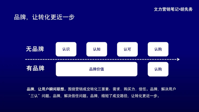 我對品牌的理解,品牌讓用戶瞬間聯(lián)想你是誰,做什么的。影響用戶下單購買,3個核心要素:需求、購買力和信任。品牌要解決的正是其中最難的環(huán)節(jié),信任。