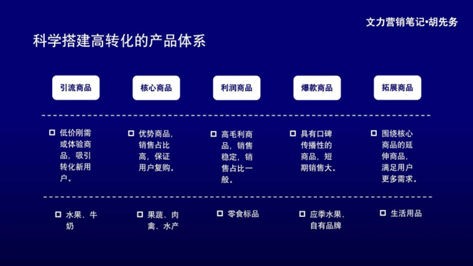 一套完整的產(chǎn)品體系包括引流商品、核心商品、利潤商品、爆款商品和拓展商品。這里拿零售行業(yè)舉例,每類商品概念對應(yīng)做了補(bǔ)充說明。
