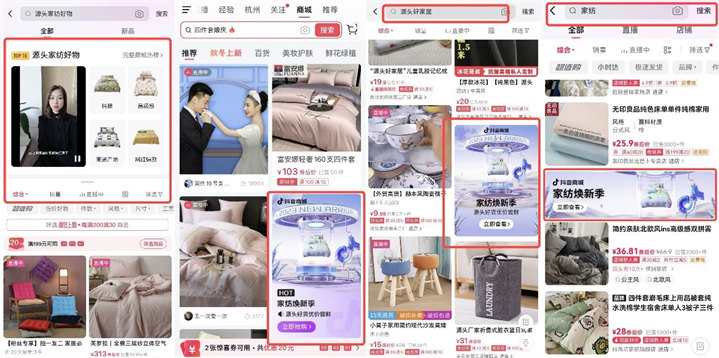 為了更好的承接優(yōu)質內容帶來的流量熱度,進一步激發(fā)活動勢能,「源頭好家居·家紡煥新季」積極布局貨架場景,在搜索、抖音商城等主要觸點為品牌提供豐厚的資源扶持,既縮短用戶消費鏈路又調動商家經(jīng)營積極性,進而促進下單轉化。例如,多觸點鋪設商城入口,當用戶在抖音商城搜索“源頭好家居”,即可一鍵點擊活動banner入口,進入活動主會場。 同時,活動還推出訂單打榜增量,助力商家豐富貨架場景,為符合條件的商家提供的不同梯度的專場投流支持,拉動訂單增長,產品爆發(fā)。活動期間,日均訂單環(huán)比增加19%。