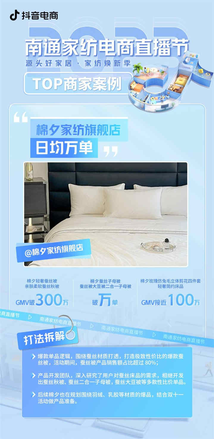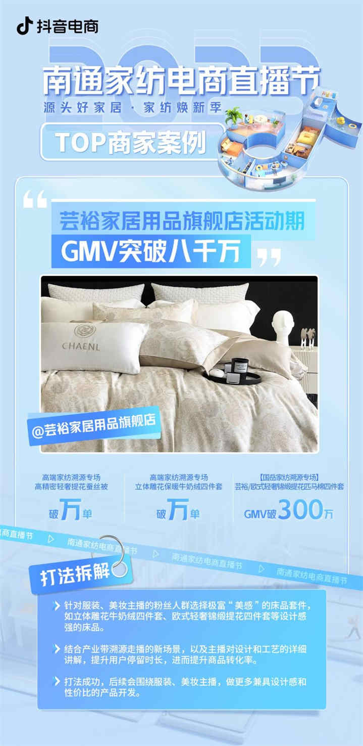 這是抖音電商助力源頭好物出圈、推動產業(yè)帶商家發(fā)展的又一次成功嘗試。從長遠來看,“源頭好家居”這一行業(yè)心智IP,不僅僅幫助南通家紡產業(yè)帶商家走向更廣闊的市場,實現(xiàn)生意破局增長,也助推南通家紡產業(yè)帶打造出鮮明的城市名片,將“南通”和“優(yōu)質紡織產品”畫上等號,形成穩(wěn)定的消費認知,從而有效推動地方產業(yè)帶商家的升級發(fā)展。