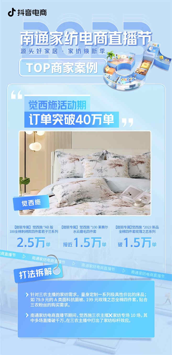 商家覺西施則針對三農主播的粉絲群體高價格敏感度的特點,為其量身定制出一系列極具性價比的床品,例如79.9元的A類面料抗菌被、199元玫瑰之戀全棉四件套,主動貼合用戶消費習慣,以低價好物激發(fā)用戶購買欲望。活動期間,覺西施訂單突破40萬單,多個家紡直播專場破千萬,成為南通家紡產業(yè)帶的標桿商家。