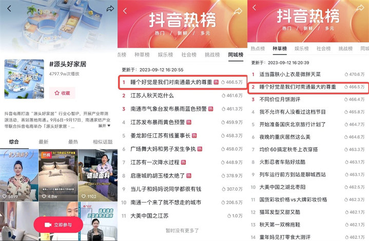 為了進一步放大活動聲量,此次活動推出了#源頭好家居、#家紡換新季、#睡個好覺是我們對南通最大的尊重 等多個話題,鼓勵商家、達人及用戶輸出家紡產品相關優(yōu)質內容。其中,話題# 睡個好覺是我們對南通最大的尊重 登上同城榜TOP1,種草榜TOP2,初步構建起家紡產品與南通產地的聯(lián)想心智。